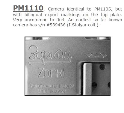 Я ни разу за свою практику, 23 года, не видел Зоркий, последний вариант, с двойной надписью. Думаю, что это на позднюю камеру поставили верхнюю крышку от более раннего аппарата. " Мне приходилось видеть Зоркие с двойной надписью только до номера 410 000.