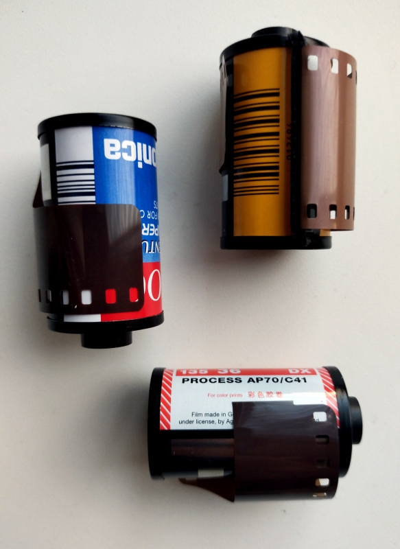 У более современных пленок незамятые кончики - вероятность того, что они не были в захватах приемной катушки фотоаппарата. Наверное, только Kodak Gold отснята из всего этого набора.