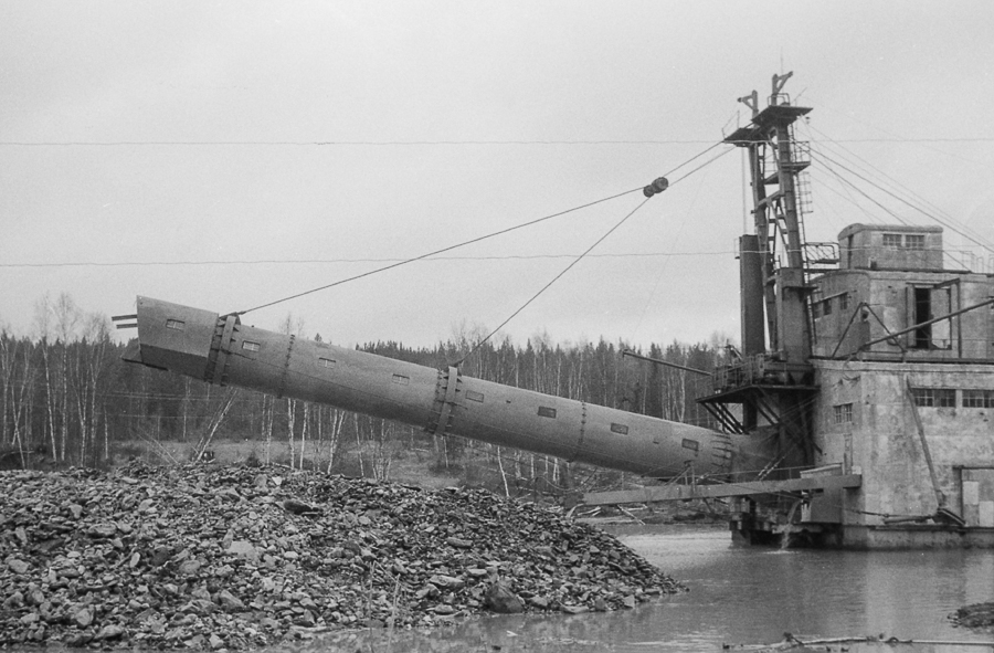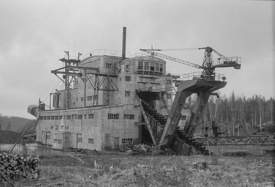 С помощью таких драг, добывали (может и добывают) золото и алмазы в реках и речках большой страны. Здесь драга с черпаком на 250 литров, изготовленная Иркутским заводом тяжёлого машиностроения. Попутно узнал, что там же сделана самая большая в мире речная драга с ковшом 600 литров